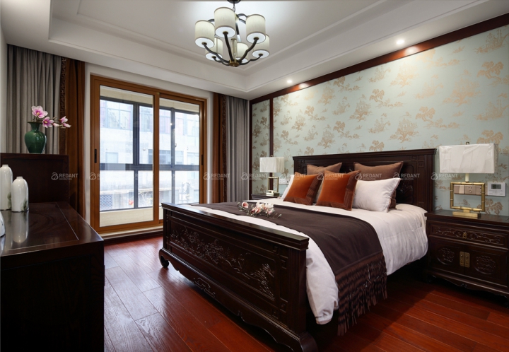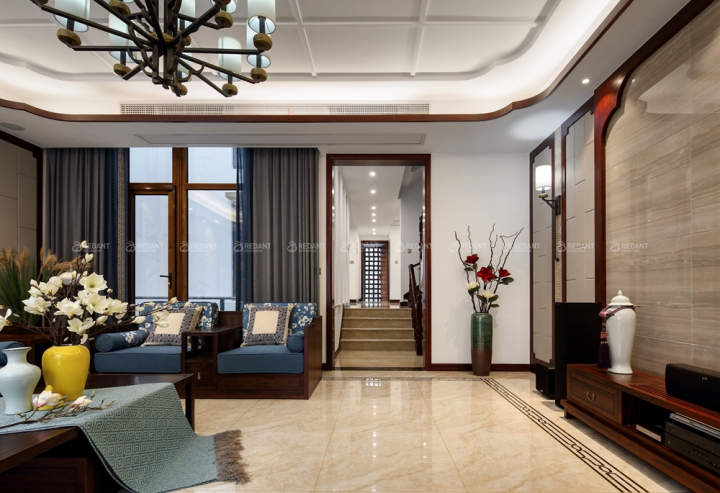 传统中式装修设计中色调都比较偏暗,其中暗红色是大部分传统中式装修的主色调。在新中式装修风格中,配色的运用更为多样,可以选用比较明快的颜色作为整间房间的基调,在墙面、过道的设计上再加上木质、砖石的配合,让整间屋子显得更有韵味又不失时尚。