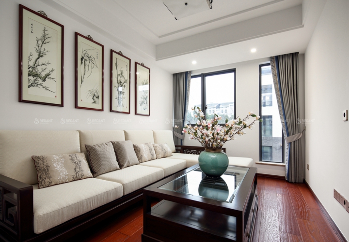 新中式装修中的一大亮点是改变墙体平面的创新性设计,通过让部分面积的墙体整体内陷让墙面看上去更加立体。在凹陷处适当放置一些传统中式装饰物,如花瓶、山水字画等,能提升整间房间的质感。