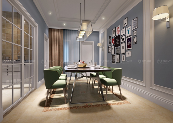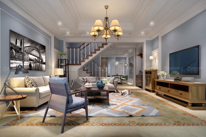 客厅作为待客区域,一般要求简洁明快,同时装修较其它空间要更明快光鲜,通常使用大量的石材和木饰面装饰;美国人喜欢有历史感的东西,这不仅反映在软装摆件上对仿古艺术品的喜爱,同时也反映在装修上对各种仿古墙地砖、石材的偏爱和对各种仿旧工艺的追求上。总体而言,美式田园风格的客厅是宽敞而富有历史气息的。