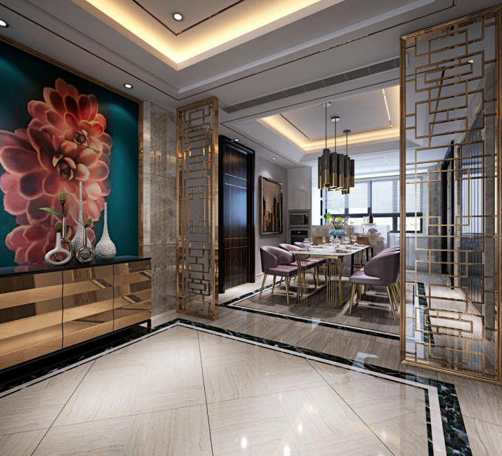 本案是一套港式风格,主要还是已现代设计手法处理,在入户门厅背景上设计了一副抽象式的油画,门厅两侧使用了不锈钢屏风隔断,给人一种怀古的浪漫情怀与现代人对生活的需求相结合。在客厅设计方面,电视背景与次卧的房门及沙发背景又与主卧房门巧妙的融合在了一体,促使了客厅空间比较整体。在材料运用方面,主要是以大理石、不锈钢、木饰面、墙纸等;在色彩搭配上,主要使用白色、灰色、金色等色调,少量绿色的糅合使色彩看起来明亮、大方,使整个空间给人以开放、宽容的非凡气度、让人丝毫不显局促。
