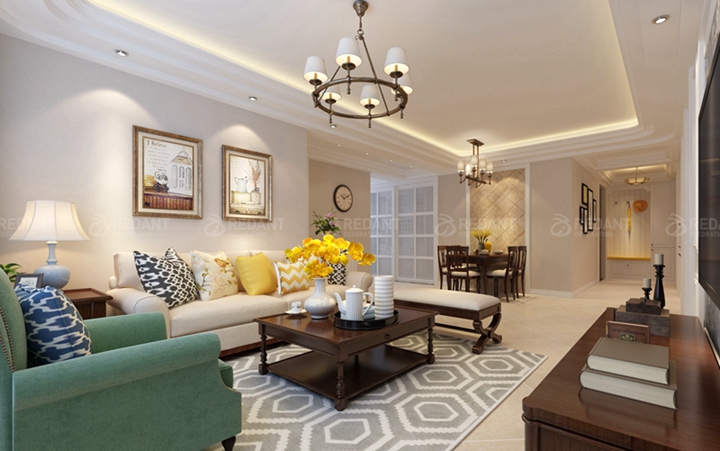 本次案例以休闲美式风格为主,用包容性极强的中性色调——米色调来凸显空间里的碧海、明黄。色彩调和作用使得整个空间的层次感更加分明,小家亦更加清新明亮,无需刻意营造便生出一种休闲式的浪漫风情!