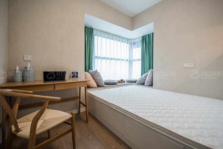 本案业主经过沟通非常喜欢北欧风格,因为要和母亲一起住,母亲眼睛不好所以整体采用了浅色调,营造一种温馨舒服的感觉,客厅电视背景墙用木地板装饰,舒适又自然,布艺沙发配上偏中式的山水画,(业主喜欢古玩)轻微混搭,地面采用芒果的瓷砖进行斜贴,丰富不单调,卧室采用的米色窗帘与浅绿色背景搭配木色家具,给业主营造一个舒适的睡眠空间。榻榻米房间,不仅考虑收纳,同时又是客卧,局部考虑灯光细节,方便夜晚起来主灯刺眼的情况。当最终实景呈现在业主面前时,女主人和妈妈激动地握着设计师的手说着感谢的话,说没有选错红蚂蚁装饰,业主的满意是对我们最大的认可。