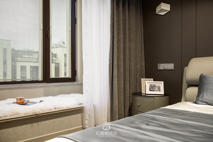 卧室的整体色调偏暗,但不沉闷,床头的软包背景墙将冰冷的墙面覆盖,给人一种温暖的感觉,拉上窗帘在此美美睡上一觉,妙哉!