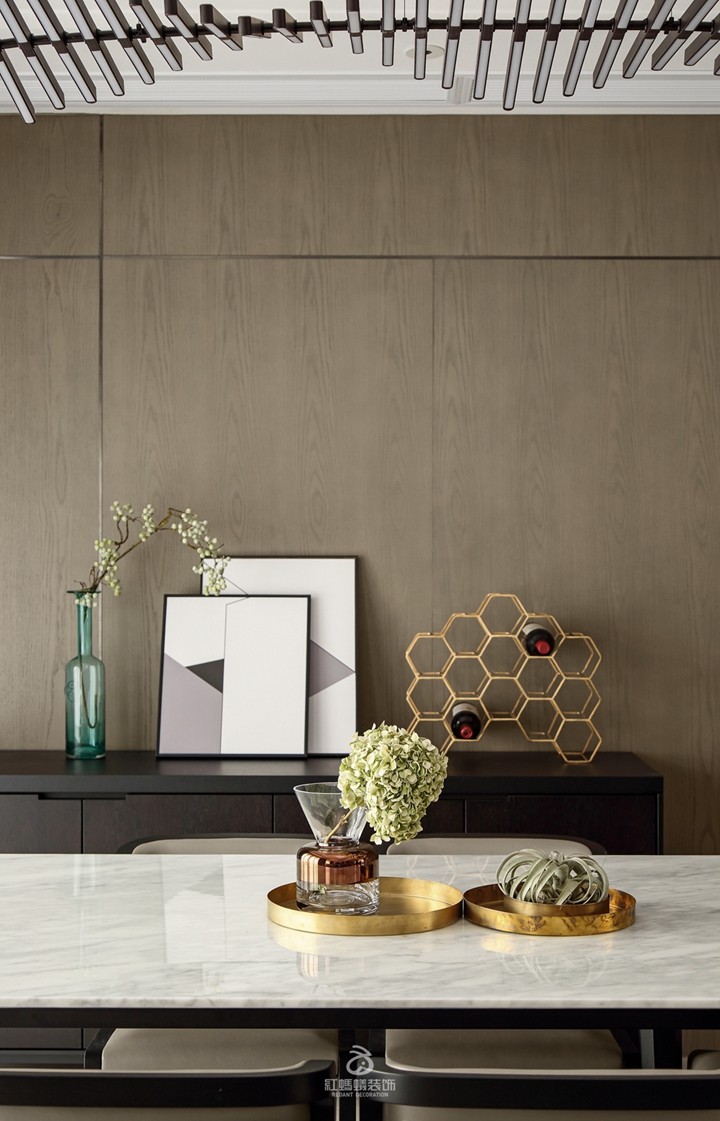 餐厅的实木护墙板背景嵌上金属线条,与电视背景墙相呼应。黑灰色系的餐边柜和餐桌椅与客厅沙发茶几呼应的同时,将简洁的风格特色展现的淋漓尽致。
