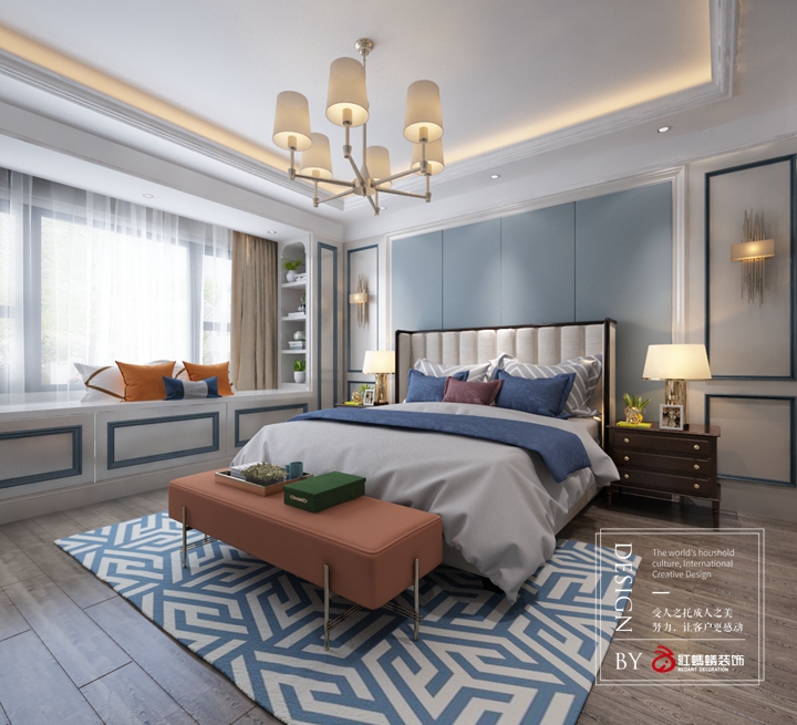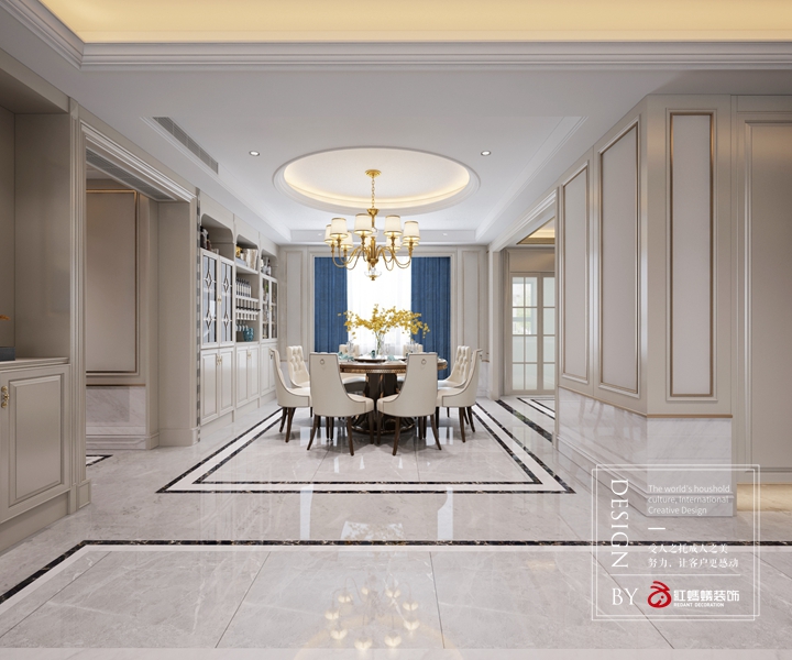 本案设计以米色为主搭配宝石蓝色、金色、金属色,从整体到局部,将古典的浪漫情怀与现代人对生活的需求相结合,兼具华贵典雅与时尚现代。在地面使用石材瓷砖拼花,用石材天然的纹理和自然地色彩来体现整个空间的品质感,是客厅和卧室的奢华气质毫无保留地流淌。在家具配置上浅色皮艺沙发,在软装配饰上则使用蓝色、浅黄色、深咖色等为基调,糅合少量金色使色彩看起来明亮、稳重大方。