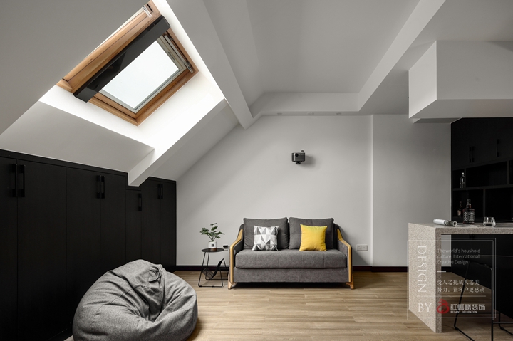 书房是男主人身、心、灵放松的区域,因为男主喜欢自由懒散的生活节奏,在空间整体规划上采用黑白灰的设计理念,黑色开放面书柜,配上深灰色漆懒人沙发,和可以打开变床的在上面打电玩的多维沙发,让空间不再沉闷。