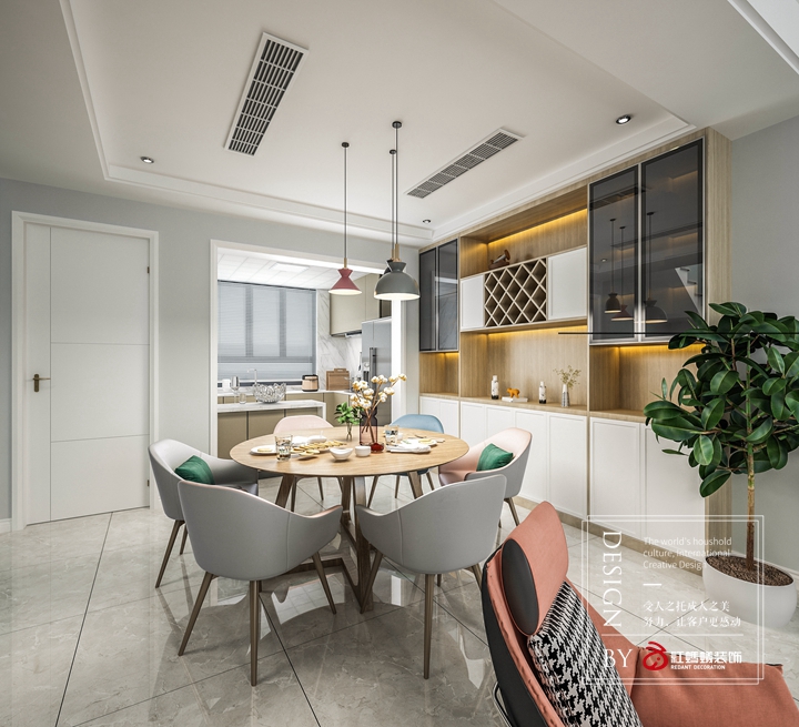 摈弃了北向书房的设定,将其打通后形成南北通透的空间,增加了西厨和大量储物柜的功能,缓解厨房储物压力的同时,也解决了进门鞋柜的问题。餐厅使用了圆形餐桌,比起方形餐桌,圆形餐桌没有尖锐的拐角,我们使用非常的安全,走路的时候也不用担心会碰到。买了圆形餐桌以后,一家人围坐在一起吃饭都可以够得到,也可以避免很多的尴尬,每个人都可以夹到自己喜欢的菜品。要是家里空间允许,可以购买圆形餐桌,摆放也会特别协调大气,家里来了客人招待也特别的方便。