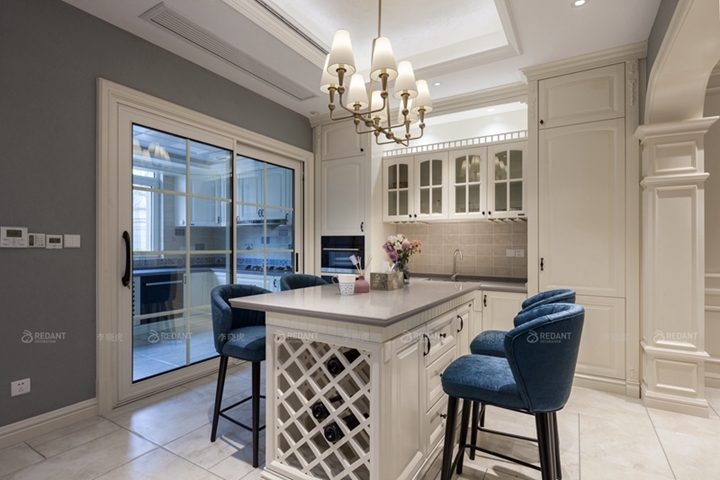 厨房在美国人眼中一般是开敞的(由于其饮食烹饪习惯),同时需要有一个便餐台在厨房的一隅,还要具备功能强大又简单耐用的厨具设备,如水槽下的残渣粉碎机,烤箱等。需要有容纳双开门冰箱的宽敞位置和足够的操作台面。在装饰上也有很多讲究,如喜好仿古面的墙砖、橱具门板喜好用实木门扇或是白色模压门扇仿木纹色。