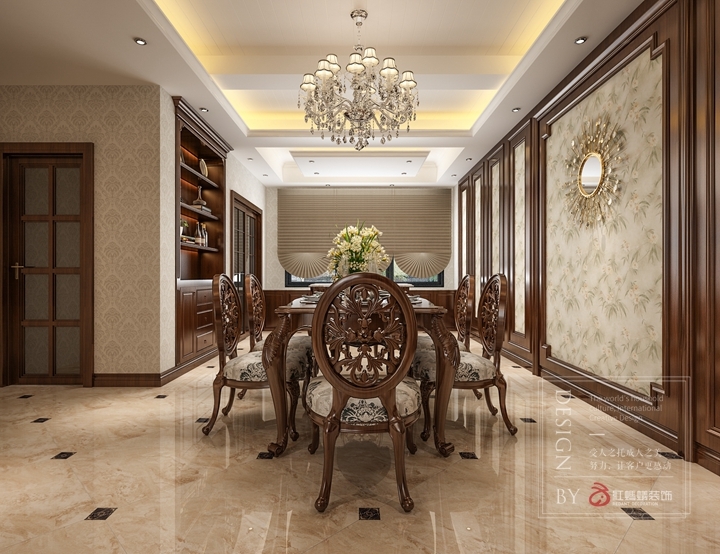 餐厅部分,设计师考虑到女主人强调的收纳功能,便在窗边做了收纳柜,在墙上做了内嵌式展示柜。精美的餐桌椅配以经典的美式风格吊灯,让以后的用餐充满的浪漫的情调。