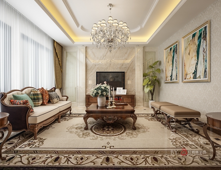 客厅的设计强调优雅的雕刻和舒适的设计,在保留了古典家具的色泽和质感的同时,又注意适应现代生活空间。在这些家具上也有一个极其显著的特征,便是美式家具中的五金饰极其精致,就算是一个小小的拉手,其造型都是层出不穷的。