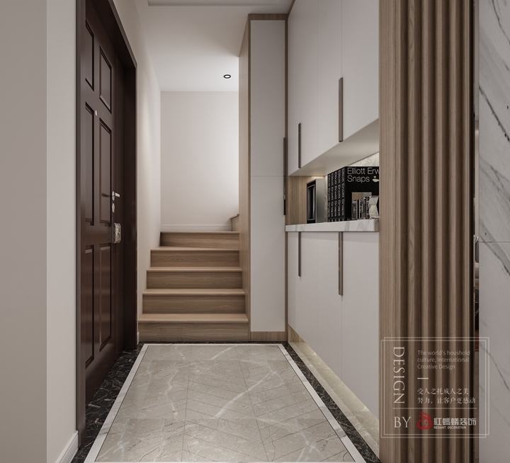 最终设计师将本案设计风格定位为现代简约风格,整体空间以木色为基调,渲染出一种纯净的典雅情怀,运用木饰面及硬包作为墙身的主材,以地面地板刻画出极具品位的艺术空间。进门第一视角便是玄关部分,设计师设计了极其简单的白色玄关柜,中部镂空处理,方便随手放置些零碎的小物件,比如手机、钥匙、包包等。