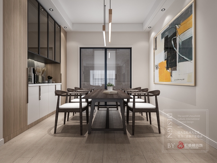 餐厅延续客厅的木质感觉,利用整面墙做了收纳柜,原木色高柜配以白色地柜,黑色调透明柜门的吊柜,另一面墙配上超大幅装饰画来画龙点睛,简约却不单调,还给人餐厅该有的温馨的感觉。